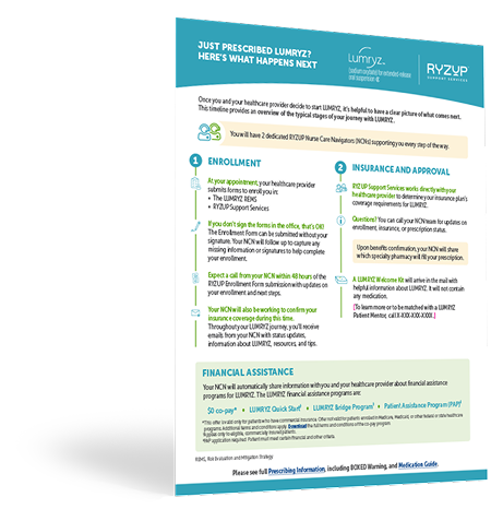 Your specialty pharmacy will call to schedule your first LUMRYZ shipment. Make sure you return any missed calls right away, as LUMRYZ cannot ship without your approval.